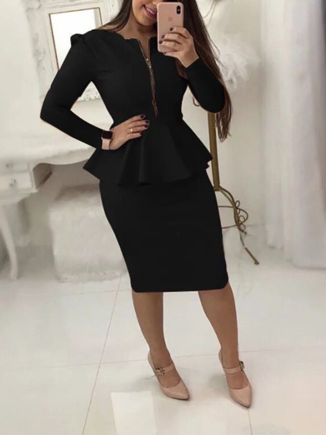 Whether you're going to a party, a casual outing, or a special event, this Black Round Neck Long Sleeves Polyester Top & Skirt Set is a must-have addition to your wardrobe.