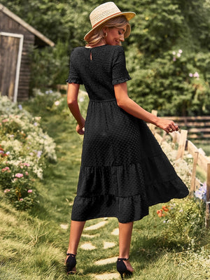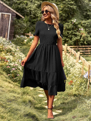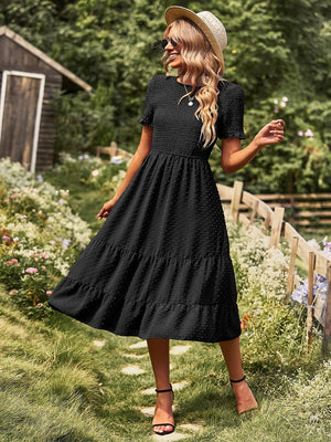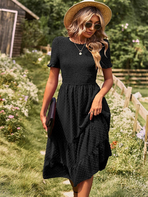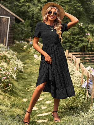This elegant A-Line dress is made from high-quality black polyester, perfect for any occasion. The flattering silhouette and versatile color make it a must-have in any wardrobe. The dress features a classic round neck neckline and a comfortable fit that will make you feel confident and stylish.