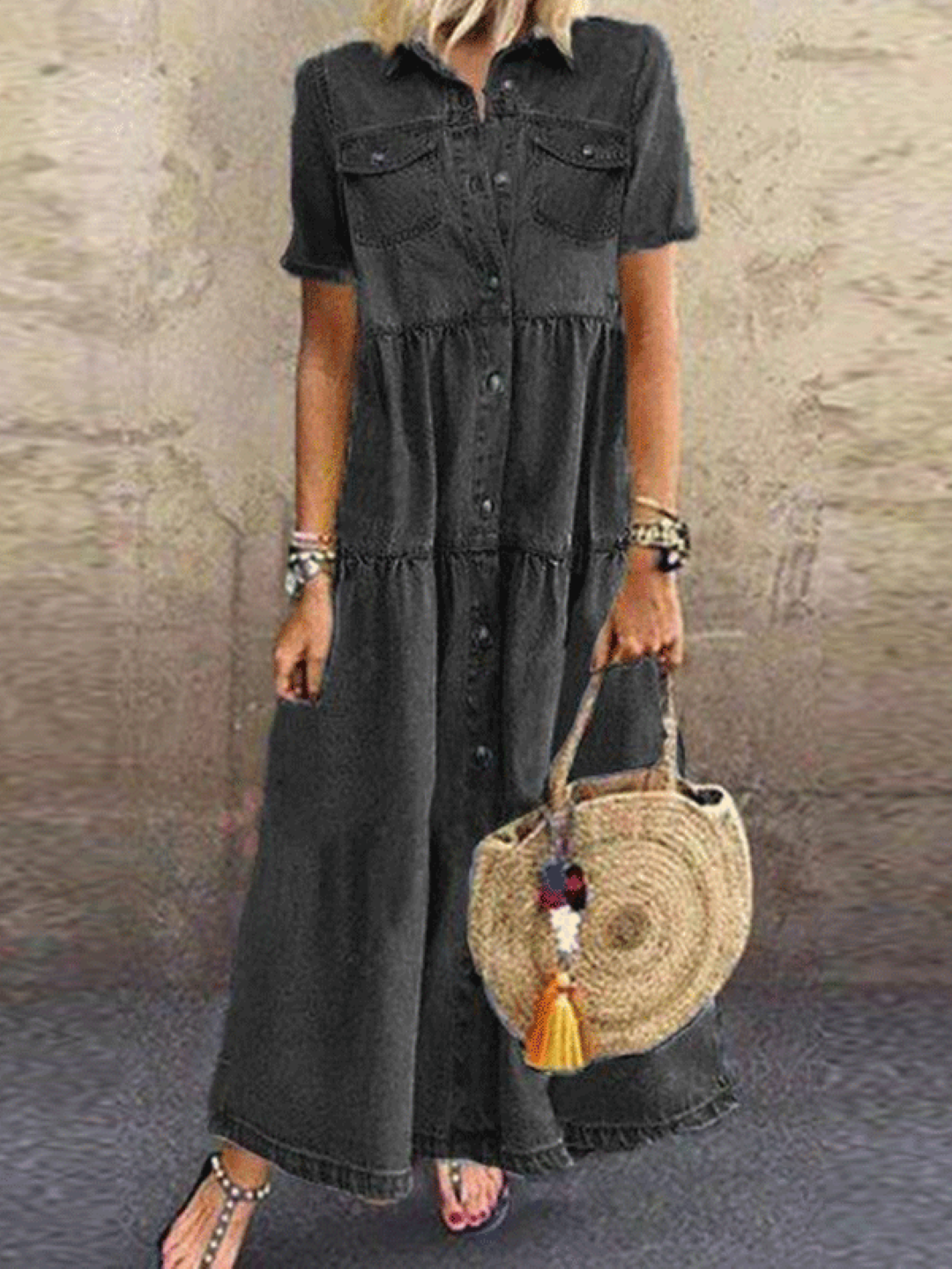 Black Round Neck Short Sleeves Maxi Solid A-Line Cotton Dress