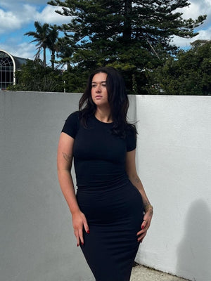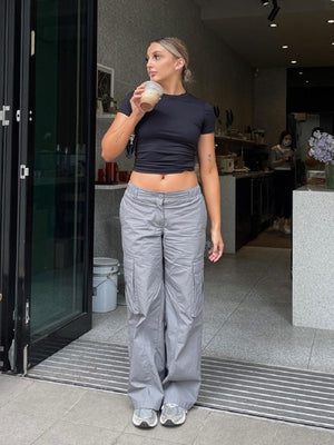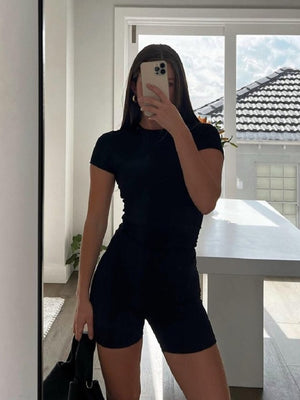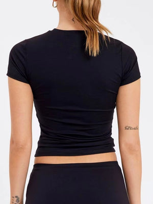 Black Round Neck Short Sleeves Solid Polyester Top