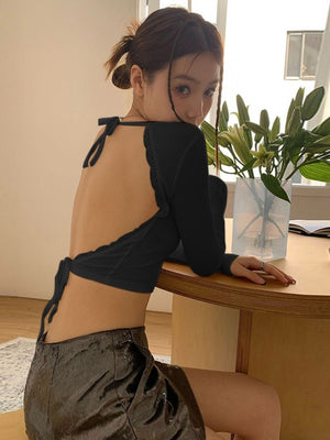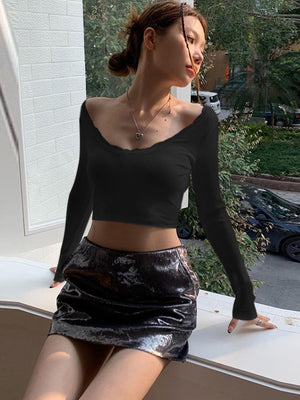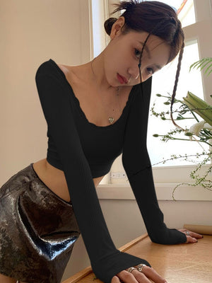 Black Round Neck Solid Long Sleeve Viscose Crop Top