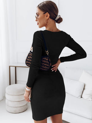 Black Round Neck Solid Long Sleeves Bodycon Polyester Above Knee Dress