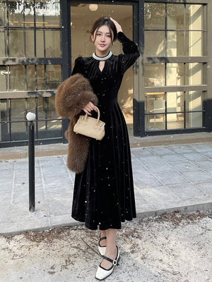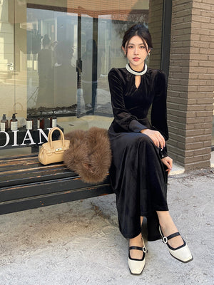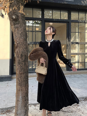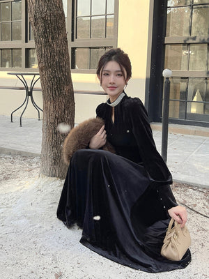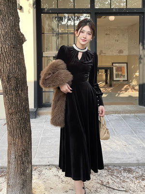 Black Round Neck Solid Long Sleeves Maxi A-Line Polyester Dress