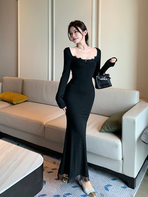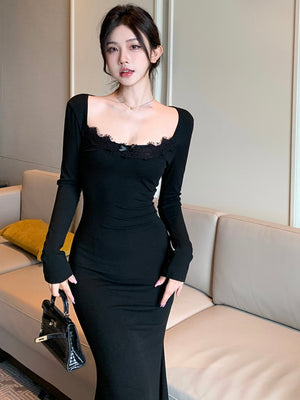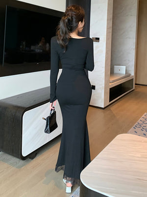 Black Round Neck Solid Long Sleeves Maxi Bodycon Polyester Dress
