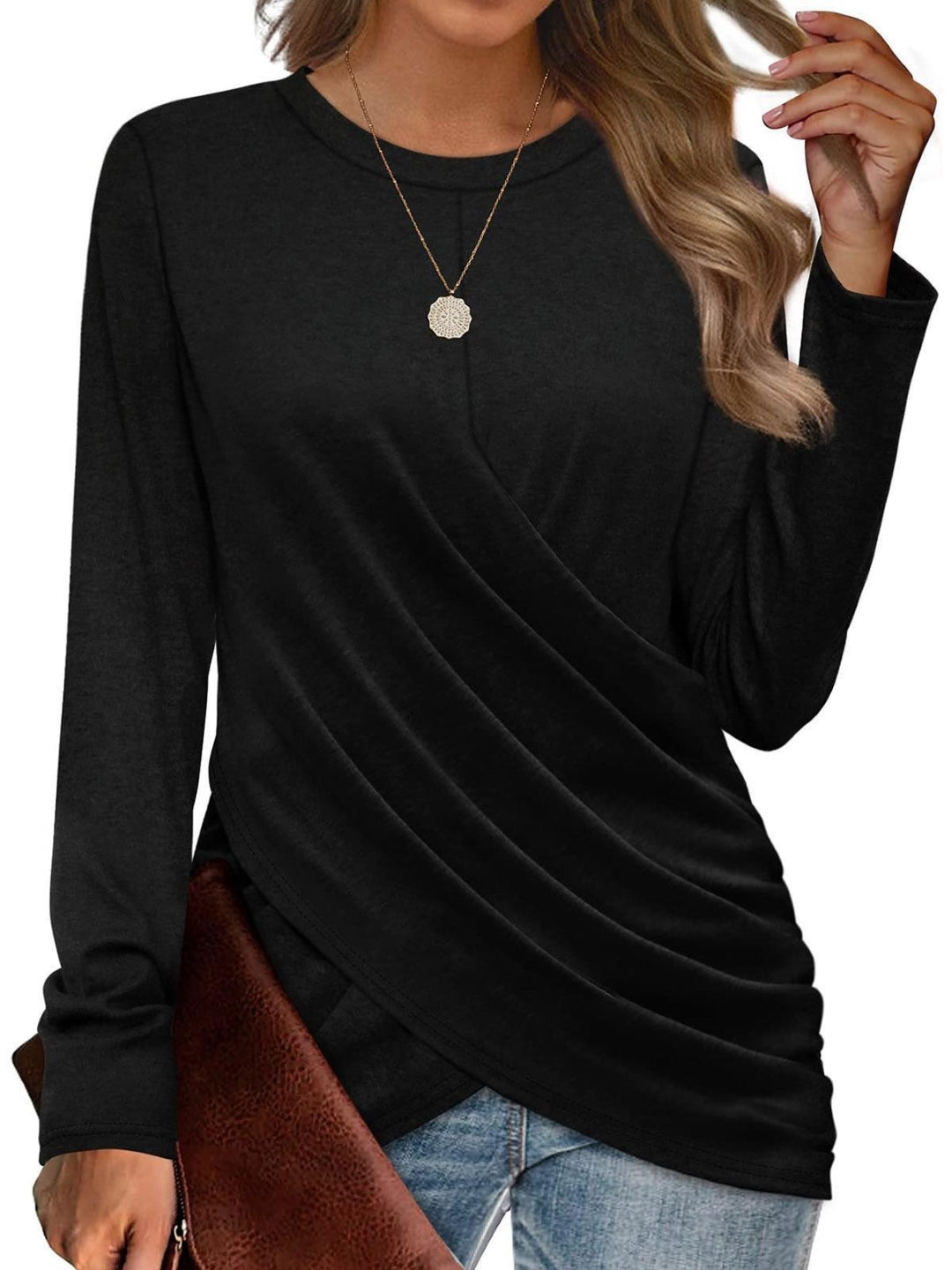 Black Round Neck Solid Long Sleeves Woven Polyester Tops