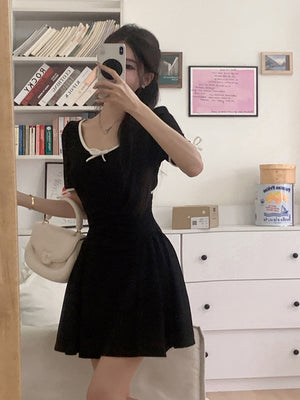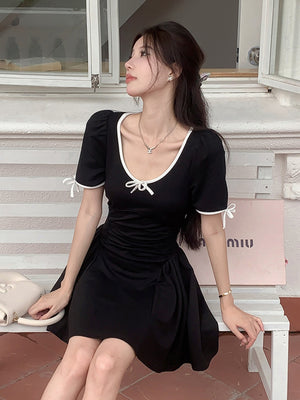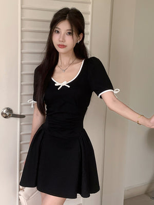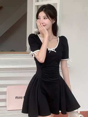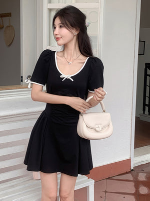 Black Round Neck Solid Short Sleeves Above Knee A-Line Polyester Dress