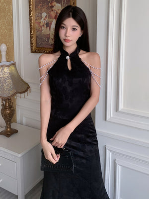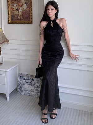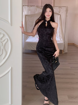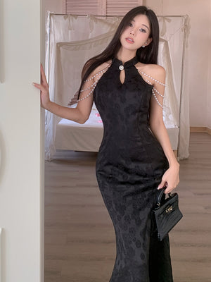 Black Round Neck Solid Sleeveless Maxi Bodycon Polyester Dress