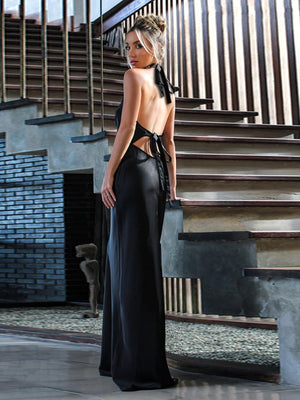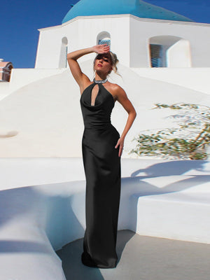 Exude timeless elegance in this Black Satin Halter Neck Keyhole Maxi Gown. Designed to make a statement, this gown features a sultry keyhole front, a fitted waist, and a luxurious satin finish that flows beautifully with every step.