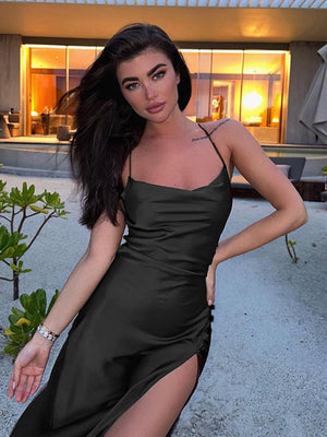 This Black Satin Split Dress is ideal for any special event. The elegant design and bodycon fit highlight your curves, with the details adding a touch of allure. Crafted from high-quality polyester fabric, this dress is both comfortable and chic.