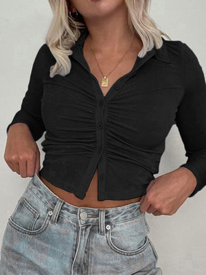 Black Shirt Collar Long Sleeves Solid Polyester Top