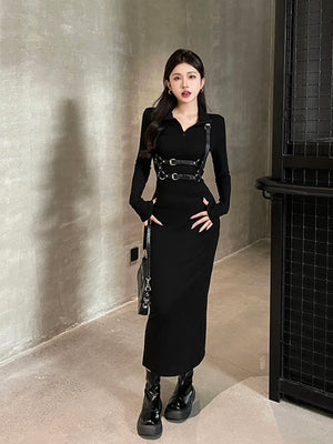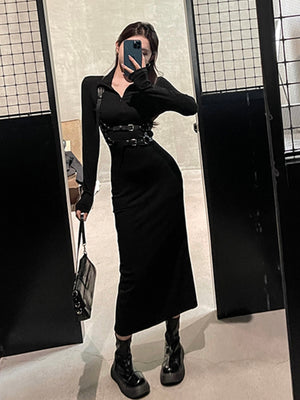 Black Shirt Collar Solid Long Sleeves Maxi Bodycon Polyester Dress