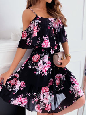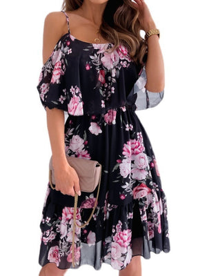 Black Shoulder Straps A-Line Short Sleeves Floral Knee Length Polyester Dress