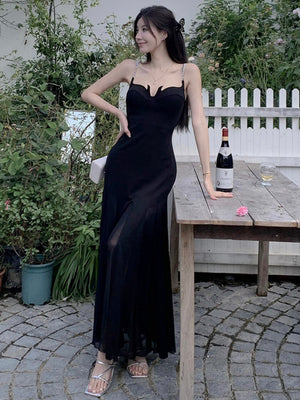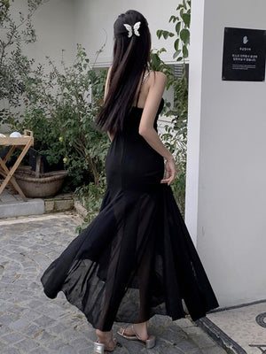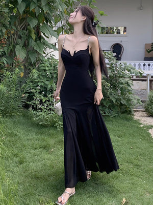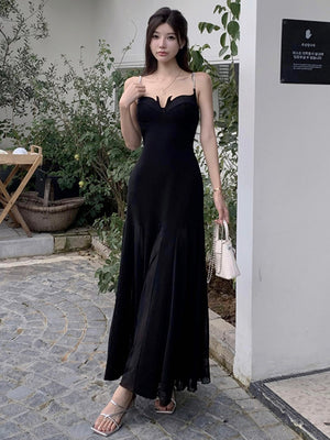Black Shoulder Straps Solid Sleeveless Maxi A-Line Polyester Dress