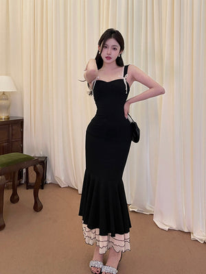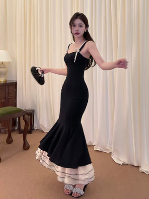 Black Shoulder Straps Solid Sleeveless Maxi A-Line Polyester Dress