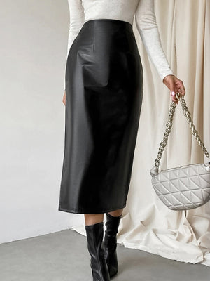 Black Solid Midi PU Skirt