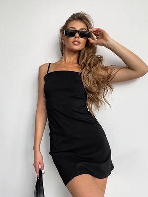 Turn heads in our Black Spaghetti Strap Mini Dress ? the ultimate little black dress every wardrobe needs. Featuring a sleek straight neckline and slim straps, this body-skimming silhouette is designed for both simplicity and impact.