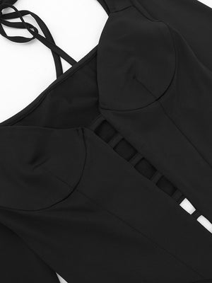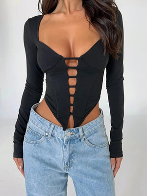 Black Square Neck Long Sleeves Cutout Polyester Top