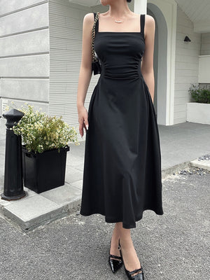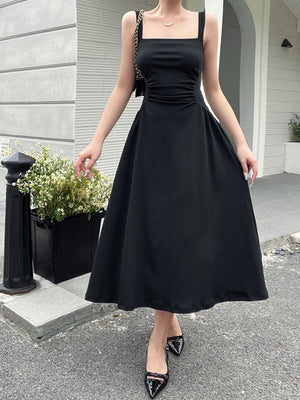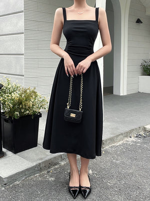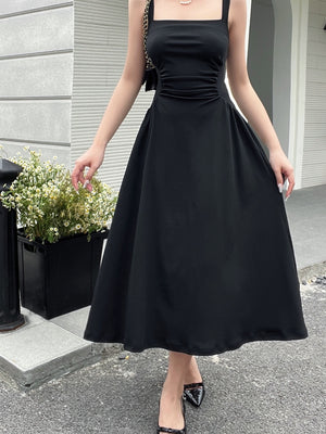Black Square Neck Sleeveless Solid Polyester A-Line Dress