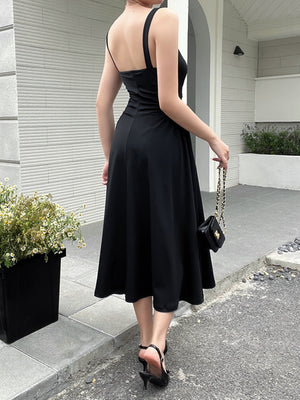 This elegant black maxi dress features a classic square neck and sleeveless, making it a versatile and timeless addition to any wardrobe.