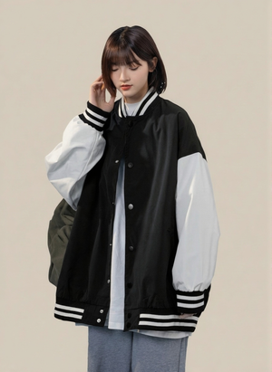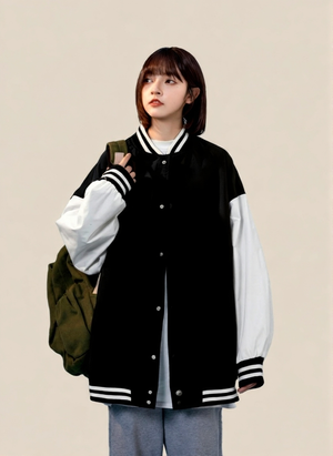 Black Stand Collar Long Sleeves Striped Polyester Open Front Jacket