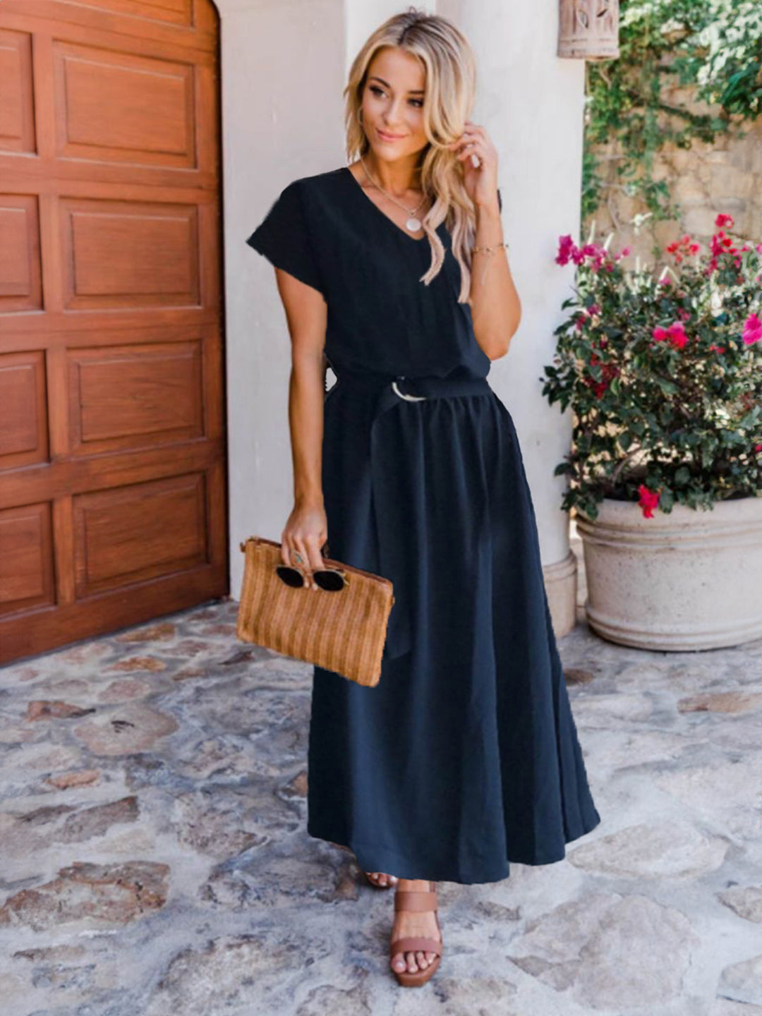 Black V-Neck A-Line Party Solid Short Sleeves Maxi Polyester Dress