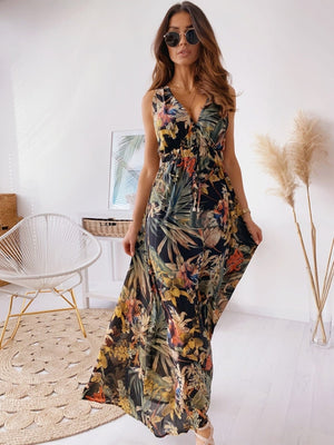 Black V-Neck A-Line Sleeveless Tropical Maxi Polyester Dress