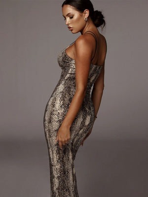 This Black V-Neck Bodycon Sleeveless Animal Maxi Polyester Dress is ideal for any special event. The elegant design and bodycon fit highlight your curves, with the details adding a touch of allure. Crafted from high-quality polyester fabric, this dress is both comfortable and chic.