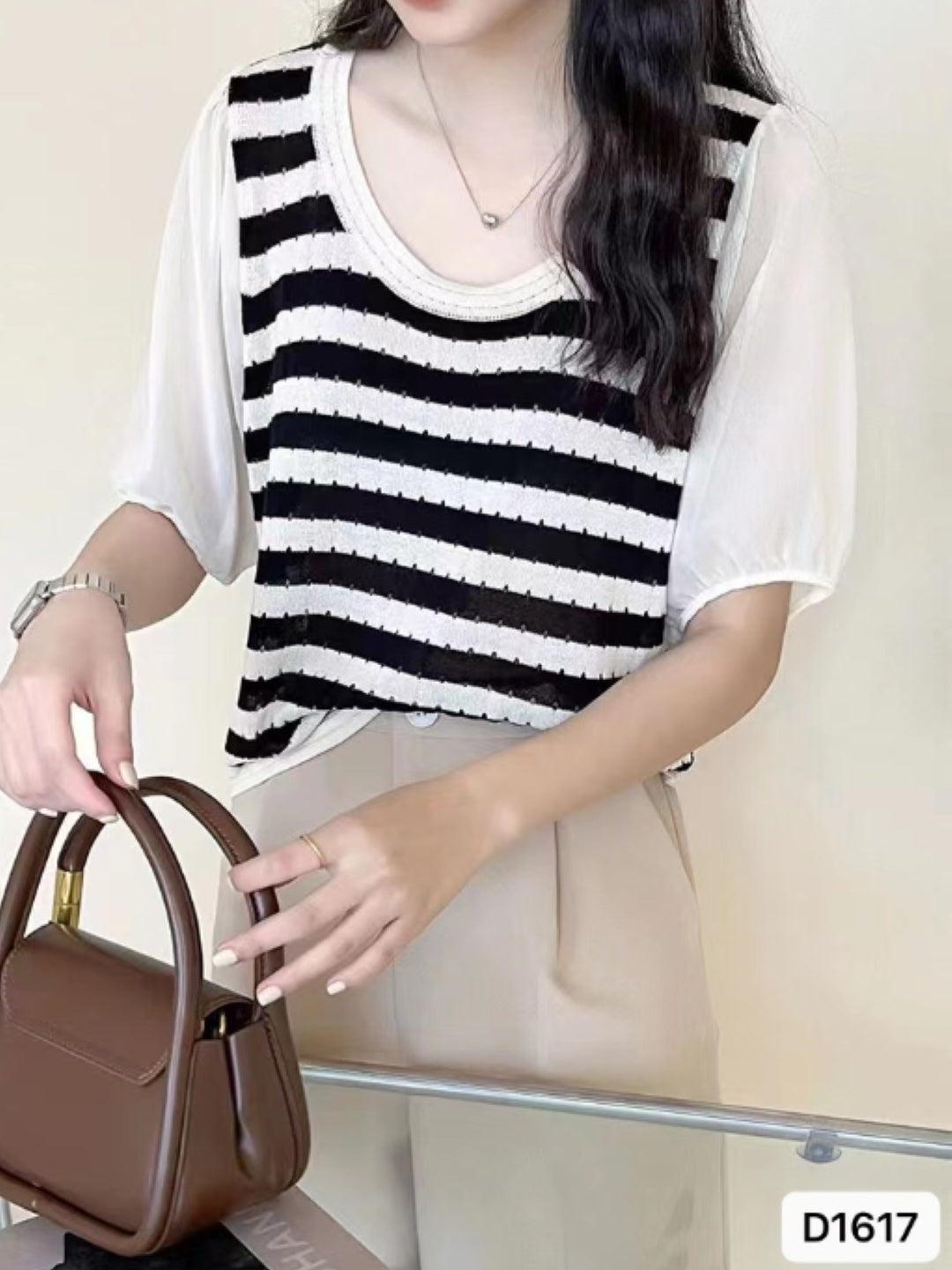 Black V-Neck Long Sleeves Horizontal Stripes Top
