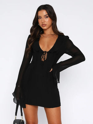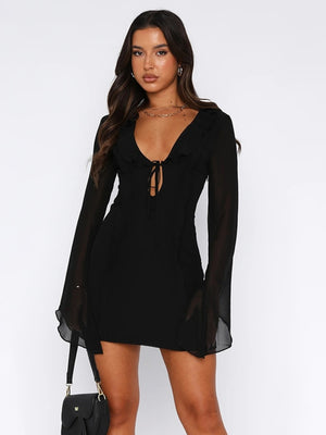 Black V-Neck Long Sleeves Solid Polyester Bodycon Dress
