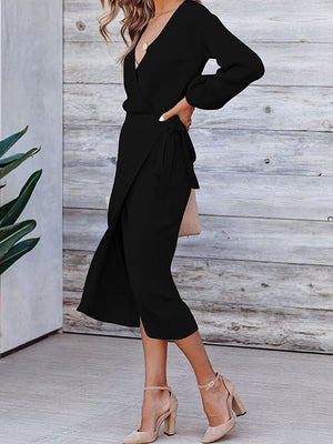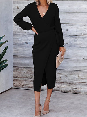 Crafted with attention to detail, this black v-neck solid long sleeves bodycon polyester knee length dress features a solid black color that exudes elegance and sophistication. Pair it with heels and statement accessories for a glamorous evening ensemble or dress it down with flats for a more casual yet stylish outfit.