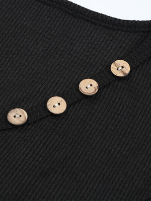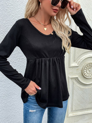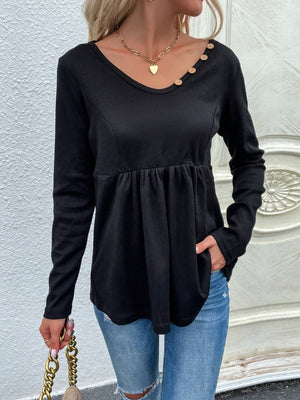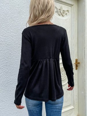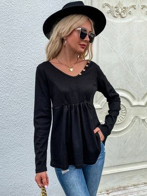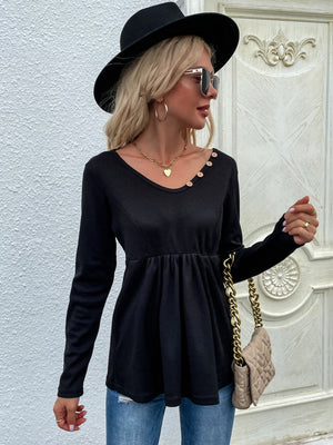 Black V-Neck Solid Long Sleeves Cotton Top
