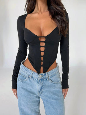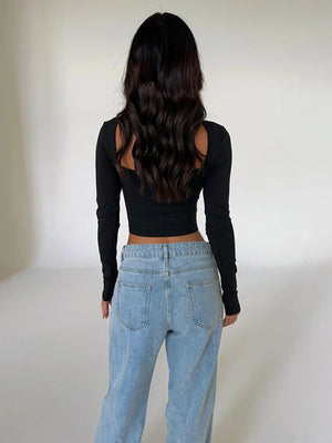 Black V-Neck Solid Long Sleeves Polyester Casual Top