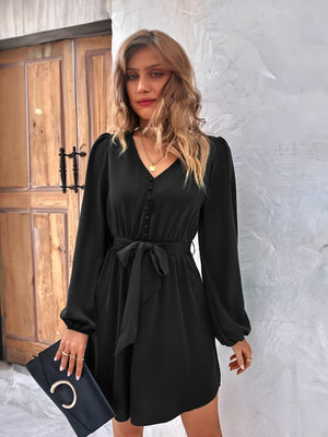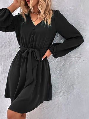 Black V-Neck Solid Long Sleeves Polyester Dress