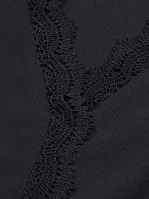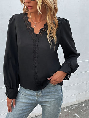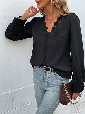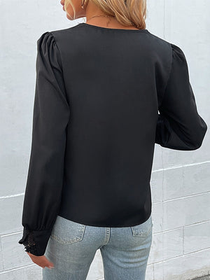 Black V-Neck Solid Long Sleeves Polyester Top