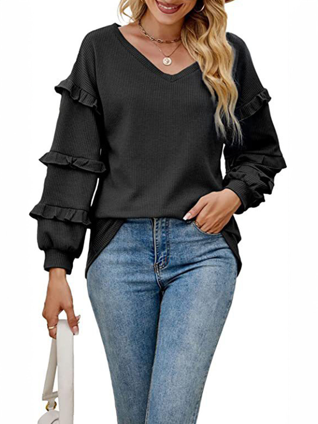 Black V-Neck Solid Long Sleeves Woven Polyester Tops