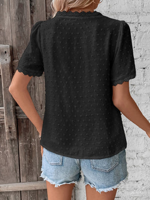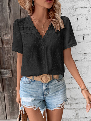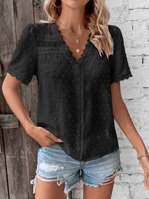 Introducing our Black V-Neck Solid Short Sleeves Polyester Top, a stylish and versatile addition to your wardrobe. Made from high-quality polyester fabric, this top offers a comfortable and breathable fit. The v-neck design adds a touch of elegance, while the black color provides a timeless and sophisticated look.