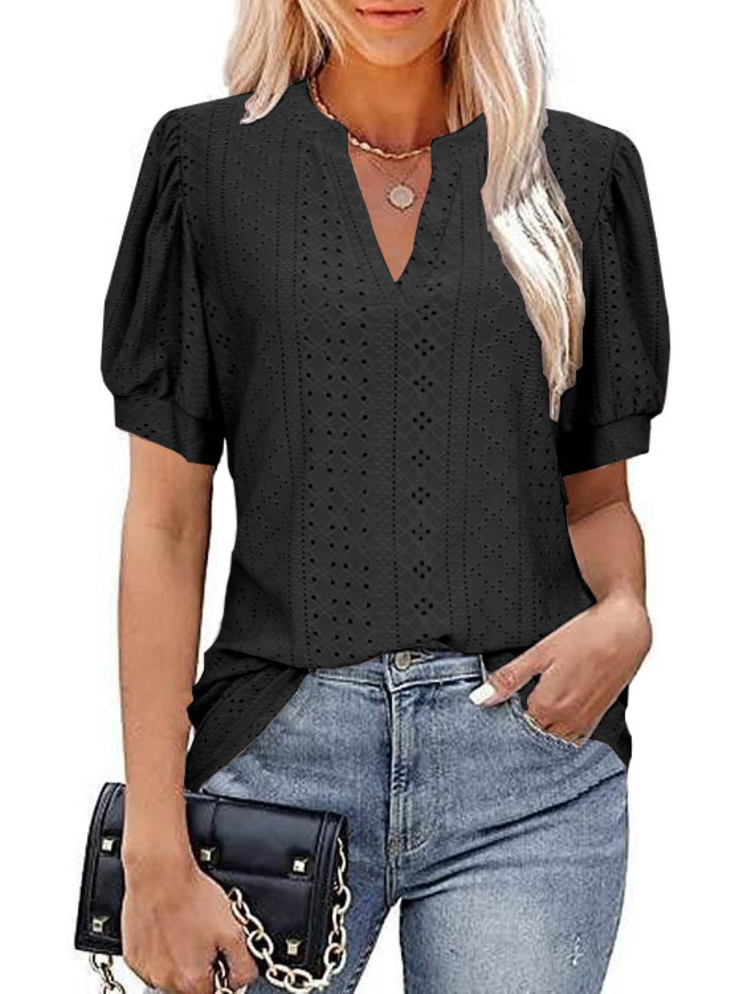 The black v-neck solid short sleeves woven polyester tops is figure-flattering and feminine. The shoulder straps neckline create an elegant silhouette, while the stretchy fabric provides all-day comfort.