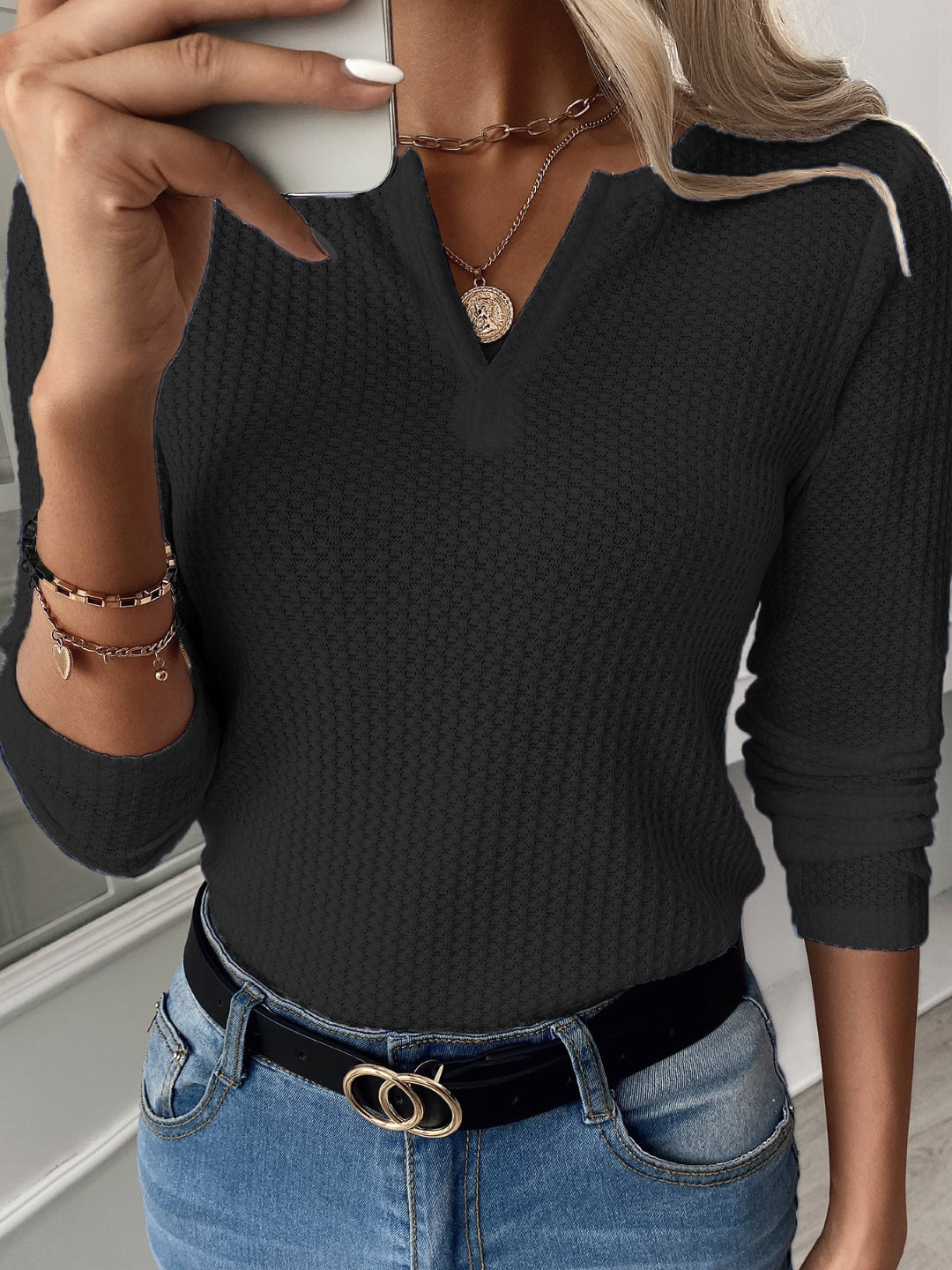Black V-Neck Solid Three-Quarter Sleeves Woven Polyester Tops