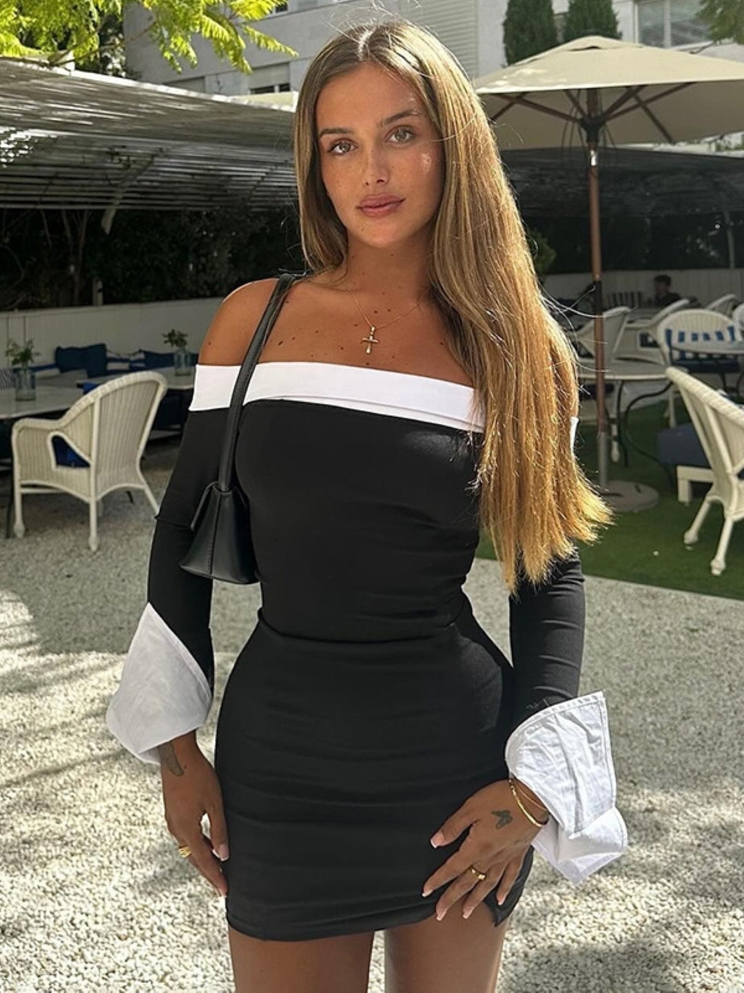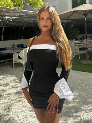 Turn heads in this chic black mini dress featuring bold white contrast details on the neckline and cuffs. Designed with an off-shoulder style and a flattering bodycon fit, this dress is perfect for parties, date nights, or any fashionable outing.