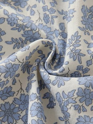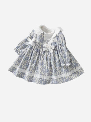 Blue A-Line Round Neck Floral Long Sleeves Cotton Dress