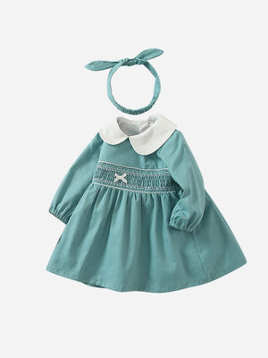 Blue A-Line Round Neck Solid Long Sleeves Cotton Dress