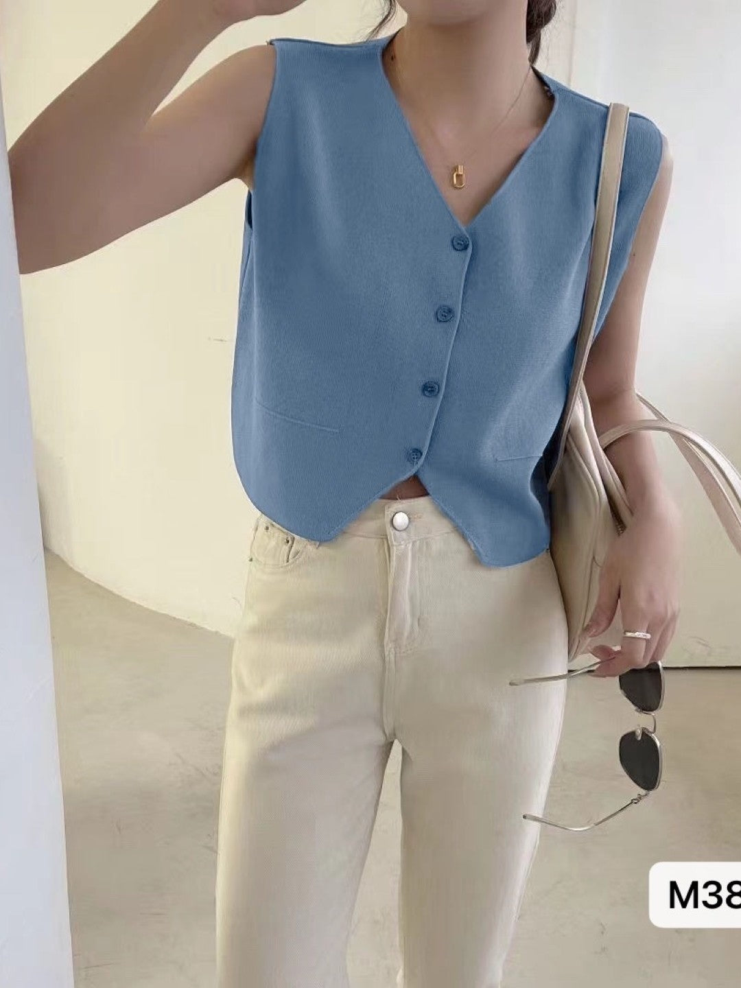 Blue Acrylic V-Neck Sleeveless Solid Top