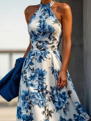 Make a bold statement in the Blue Floral Halter Neck Maxi Dress ?a perfect blend of elegance and summer charm. This stunning dress features a high halter neckline, a flattering fitted bodice, and a flowing full-length skirt adorned with vibrant blue floral prints on a white base.