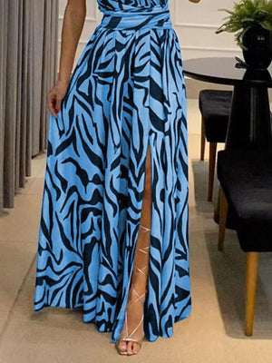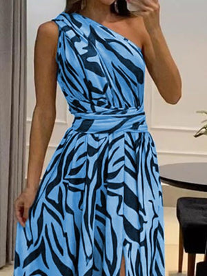 Blue One Shoulder A-Line Animal Sleeveless Maxi Polyester Dress