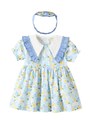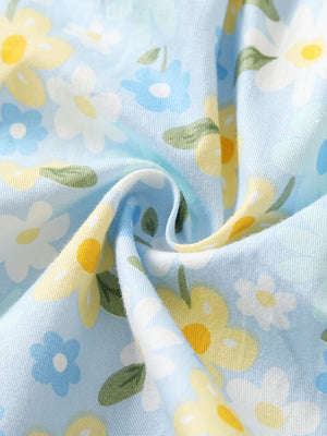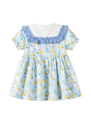 Blue Round Neck Casual A-Line Floral Short Sleeves Knee Length Cotton Dress