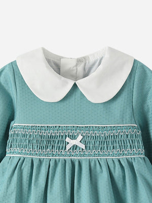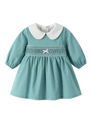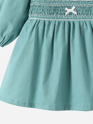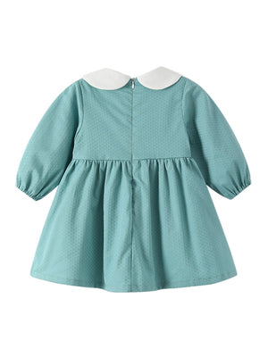 Blue Round Neck Casual A-Line Solid Long Sleeves Knee Length Cotton Dress