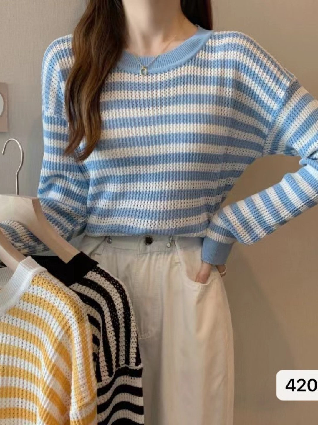 Blue Round Neck Long Sleeves Horizontal Stripes Top