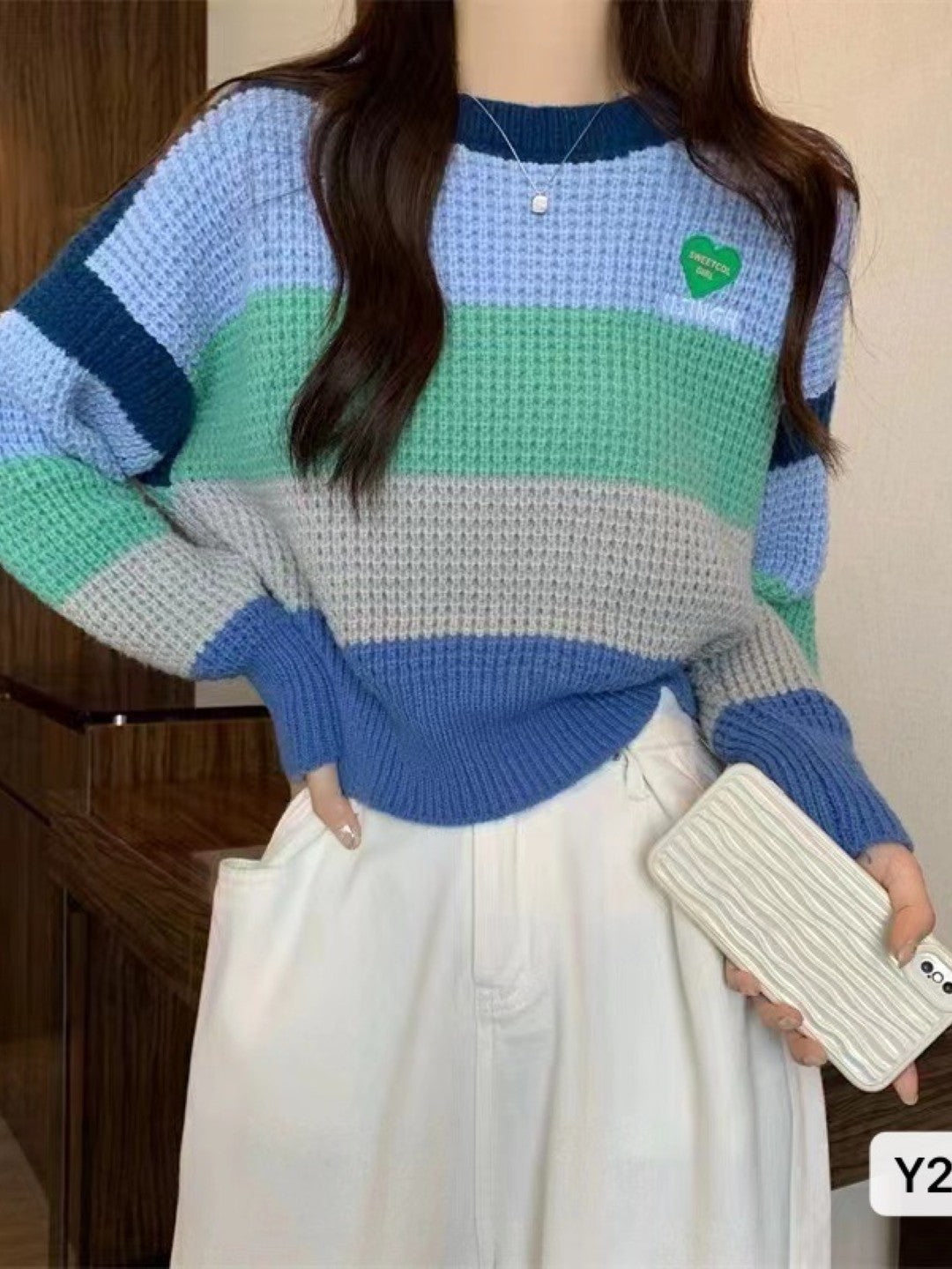 Blue Round Neck Long Sleeves Horizontal Stripes Top