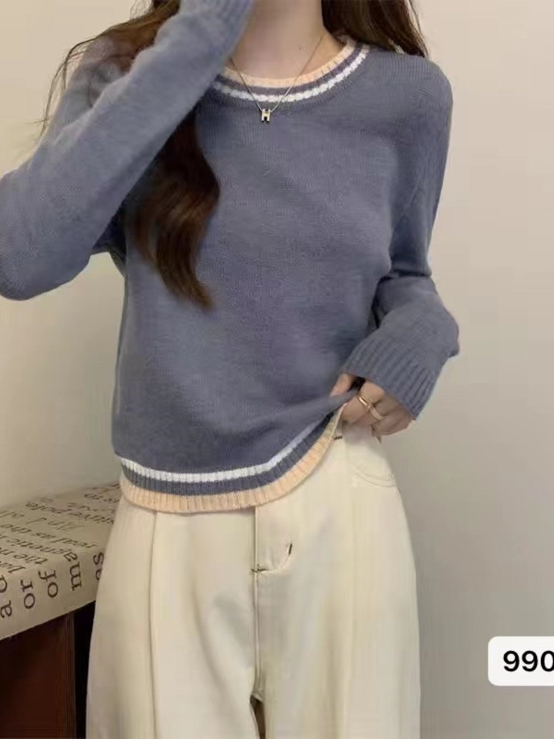 Blue Round Neck Long Sleeves Solid Regular Sleeves Acrylic Top