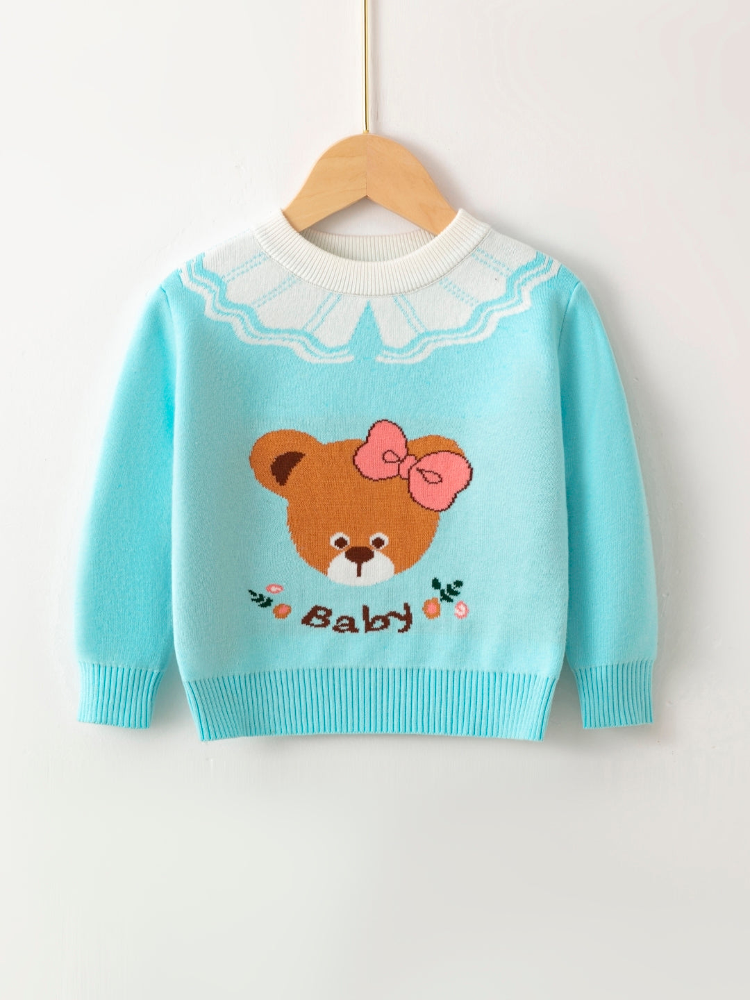 Blue Round Neck Printed Long Sleeves Casual Pullover Cotton Sweater